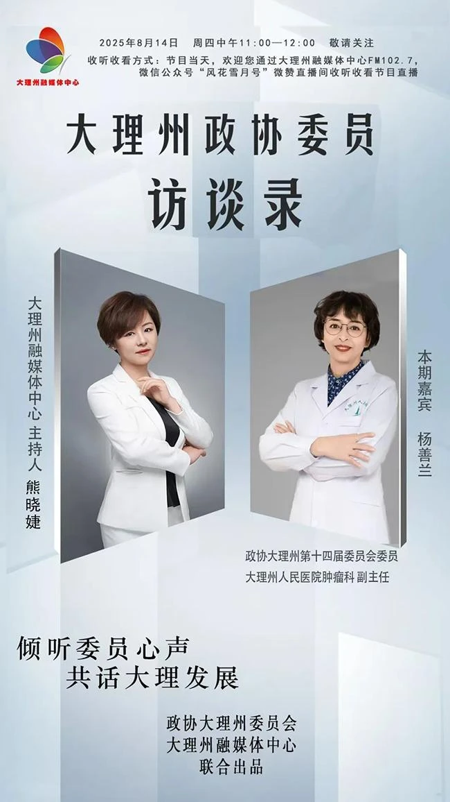 面向未来,杨善兰表示,将继续以习近平新时代中国特色社会主义思想为指导,不断加强学习,提升履职能力。她将更加紧密地联系群众,倾听民声,反映民意。同时,她将聚焦大理州肿瘤防治体系建设,依托滇西区域医疗中心建设和重庆大学附属肿瘤医院的帮扶,致力于推动建立州、县、乡一体化的肿瘤“防-筛-诊-治-康”全周期管理体系,通过资源整合、科技赋能和基层帮扶,切实降低区域内肿瘤负担,提升人民健康水平,为大理州的高质量发展贡献一名民进会员、一名医务工作者、一名政协委员的全部力量。