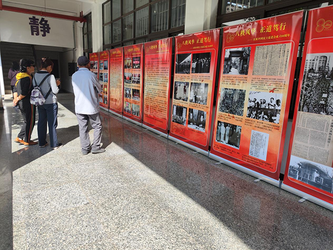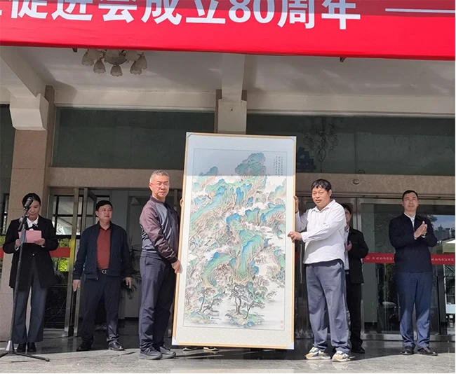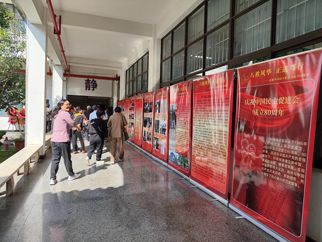 展览现场设置了庆祝民进成立80周年会史展板,通过“会史+艺术”融合的创新模式,宣传民进会史,弘扬优良传统。这一创新举措使会员和观众在欣赏水墨丹青之美的同时,通过图文并茂的会史展示,沉浸式重温民进八十载与中国共产党风雨同舟的光辉历程,实现了艺术熏陶与会史学习的相得益彰。