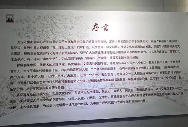 展览旨在弘扬民族文化、坚定文化自信,践行文化艺术为人民的思想,体现了人民性、时代性和艺术性,将徐霞客的生态理念和热爱生活、勇于探索的精神,融入作品之中,为旅居大理增添一抹浓郁的色彩。
