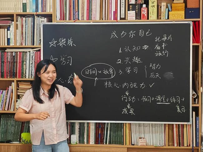 本次活动的另一个重要环节,是邀请了两位优秀的青年学子,为孩子们分享学习方法及成长历程。今年刚刚考上云南师范大学英语专业硕士的解朵朵,是一位传统文化的忠实爱好者和实践者。她喜爱并长期坚持学习书法、古筝、古诗词等,在大学期间担任书法社团的主要负责人,在长期的学习中积累了丰富的学习经验和方法,她从学习方法、心态、社会实践等角度和孩子们分享其中的关键要素。