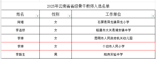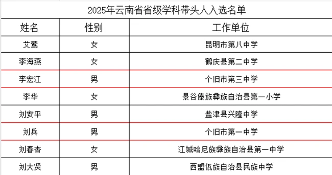 根据《云南省教育厅办公室关于做好2025年云南省基础教育省级系列骨干教师遴选推荐工作的通知》等文件要求,按照公平、公正、公开的原则,经个人申报、单位推荐、县区初审、州市复核、省级终评等程序,民进会员李宏江、刘兵入选2025年云南省省级学科带头人;李琳入选省级骨干教师 。
