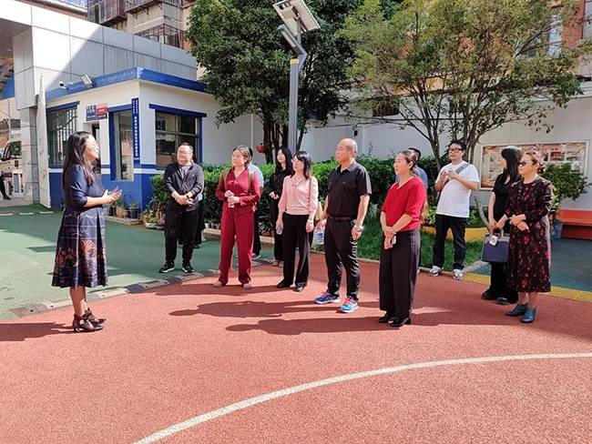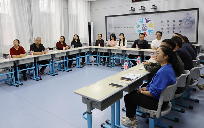 在麒麟区特殊教育学校,调研组参观了学校的融廊、资源中心、学生宿舍等,并与学校负责人、一线教师进行了面对面交流,深入了解该校“1+3+N”双向渐进融合发展模式,以及与麒麟区益宁街道牛街小学共用一个校园的普特融合教育具体实践情况。
