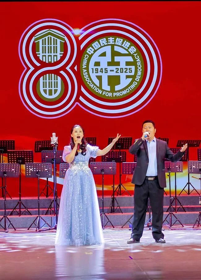演唱曲目中,既有古典诗词改编的《菩萨蛮》《江畔独步寻花》《声声慢》,也有现代流行歌曲《枕着光的她》《Mojito》《匆匆那年》,以轻松欢快的节奏和贴近生活的歌词,引发了观众的共鸣。除了合唱,音乐会还穿插了精彩的器乐表演。笛子独奏《灞桥》和筝箫合奏《幻月》。双人演唱《跟你走》则表达了民进会员对党的无限忠诚和坚定信念。此外,《向云端》的纯净旋律、《一荤一素》的温馨情感,都让观众在音乐中感受到了生活的美好与真挚。而《如愿》《我爱你中国》等经典歌曲的演唱,更是将音乐会的气氛推向了高潮。这些歌曲以其深情的歌词和激昂的旋律,激发了观众们的爱国热情和对美好生活的向往。