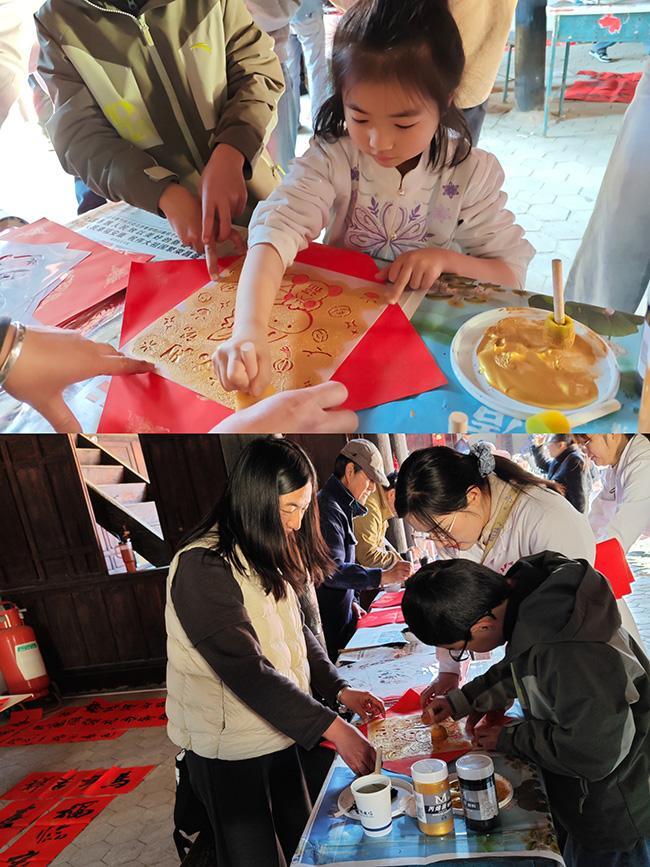 闻讯而来的群众和过往游客络绎不绝,大家围在书案旁品评挑选、有序等候。不少群众和游客在现场氛围的感染下,也兴致勃勃地提笔尝试,在书画家们的耐心指导下亲手写下“福”字和春联,体验传统书法艺术的独特魅力。现场还特别设置了木版拓印体验区,吸引了众多小朋友踊跃参与。孩子们在书画家的引导下,认真上墨、铺纸、拓印,一幅幅生动的生肖“福”字、传统吉祥图案跃然纸上。小手沾满了墨汁,脸上却洋溢着兴奋与自豪,欢声笑语在活动现场久久回荡。书画家们共义务书写春联500余副、“福”字960个,群众和游客自书作品及拓印年画近80幅,共同寄托对新春的美好期许。