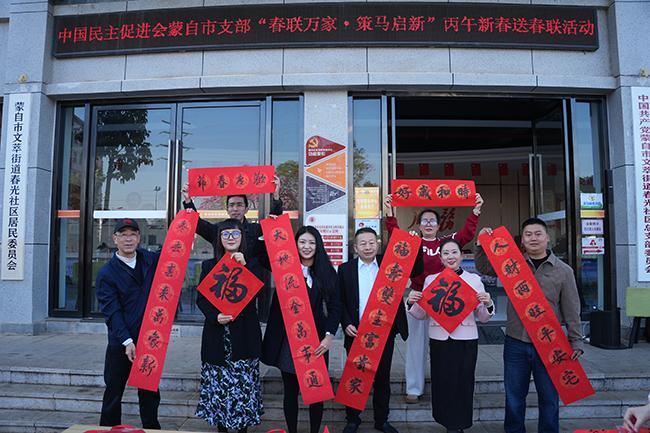 为弘扬中华优秀传统文化,践行民进社会服务宗旨,积极发挥中国特色社会主义参政党服务社会、凝聚共识作用,1月29日,民进蒙自市支部联合中共蒙自市委统战部、蒙自市人大常委会文萃街道人大工作委员会,在蒙自市春光社区开展“春联万家·策马启新”活动。活动以春联为载体,将新春祝福与美好期盼送入寻常百姓家,营造了喜庆祥和、文明进步的浓厚节日氛围。