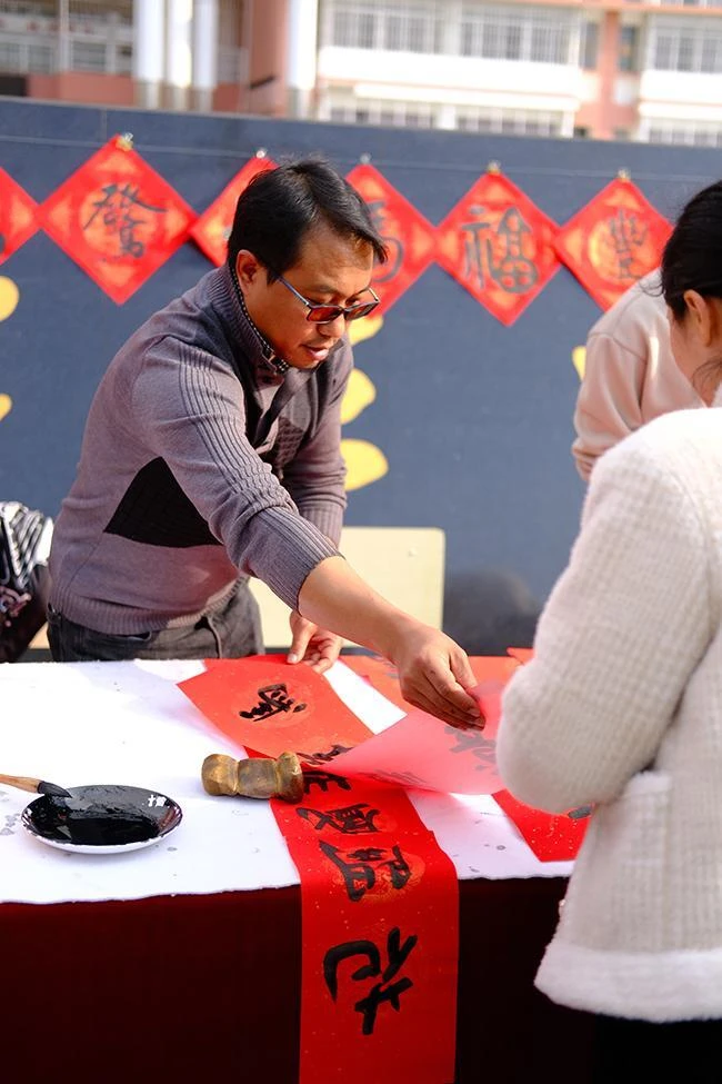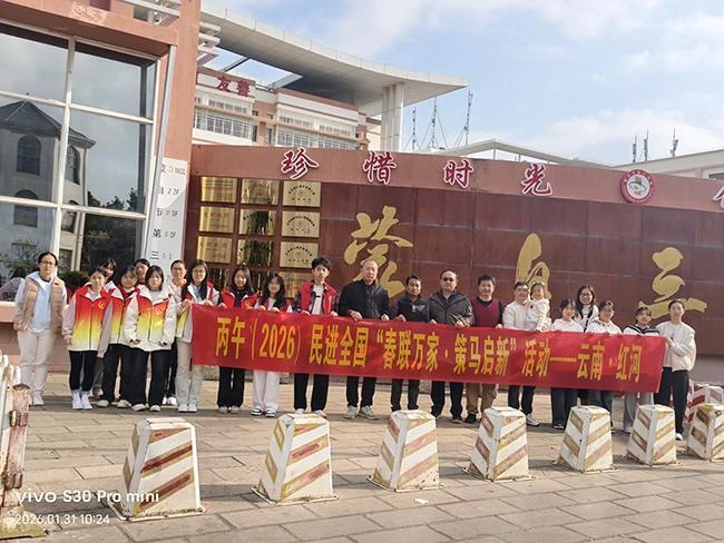 笔墨凝香迎新春,温情祝福暖人心。1月31日,蒙自市第三中学校门口暖意融融,红河民进开明画院与蒙自三中联合举办的“翰墨暖蒙城,春联送万家”送春联志愿服务活动圆满落幕。活动现场,5名来自红河开明画院的书法家与蒙自三中书法教师、特长生联袂挥毫,笔走龙蛇间,一副副寓意吉祥的春联、一个个遒劲有力的“福”字跃然纸上,为学校教职工及过往市民送上满满的新春祝福。