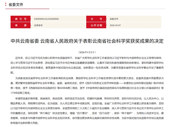 4月7日,中共云南省委、云南省人民政府关于表彰云南省社会科学奖获奖成果的决定正式发布,云南民进4名会员获5项表彰。