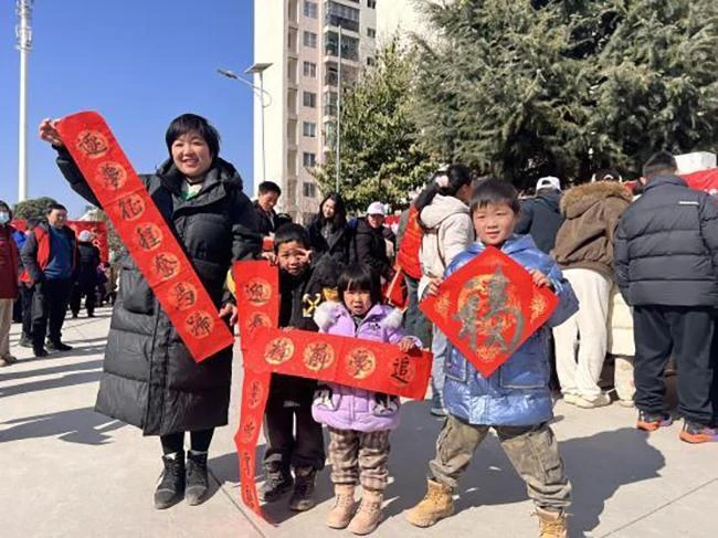 书画家们伏案挥毫,笔走龙蛇间,一副副饱含吉祥寓意的春联跃然纸上;居民们有序领取红彤彤的“福”字、春联和书画作品,孩童踮脚观摩书写过程,欢声笑语洋溢。居民们手捧墨香四溢的“福”字与牡丹、锦鲤等吉祥画作,纷纷点赞:“手写春联更有年味!感谢艺术家把祝福送到家门口!”